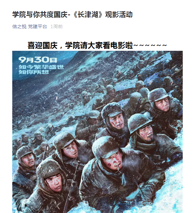 为传承红色基因、赓续红色血脉,进一步弘扬爱国主义精神,激发学生的爱国热情和奋斗精神主旋律,10月3日下午,新葡亰88805ntt组织本科生及研究生集体观看抗美援朝主题影片《长津湖》。观影结束后,学生们相互交流观影心得,纷纷表示要铭记历史,传承并弘扬伟大抗美援朝精神,站在“两个一百年”历史交汇点上不忘初心,牢记使命,为实现中华民族伟大复兴而不懈奋斗。