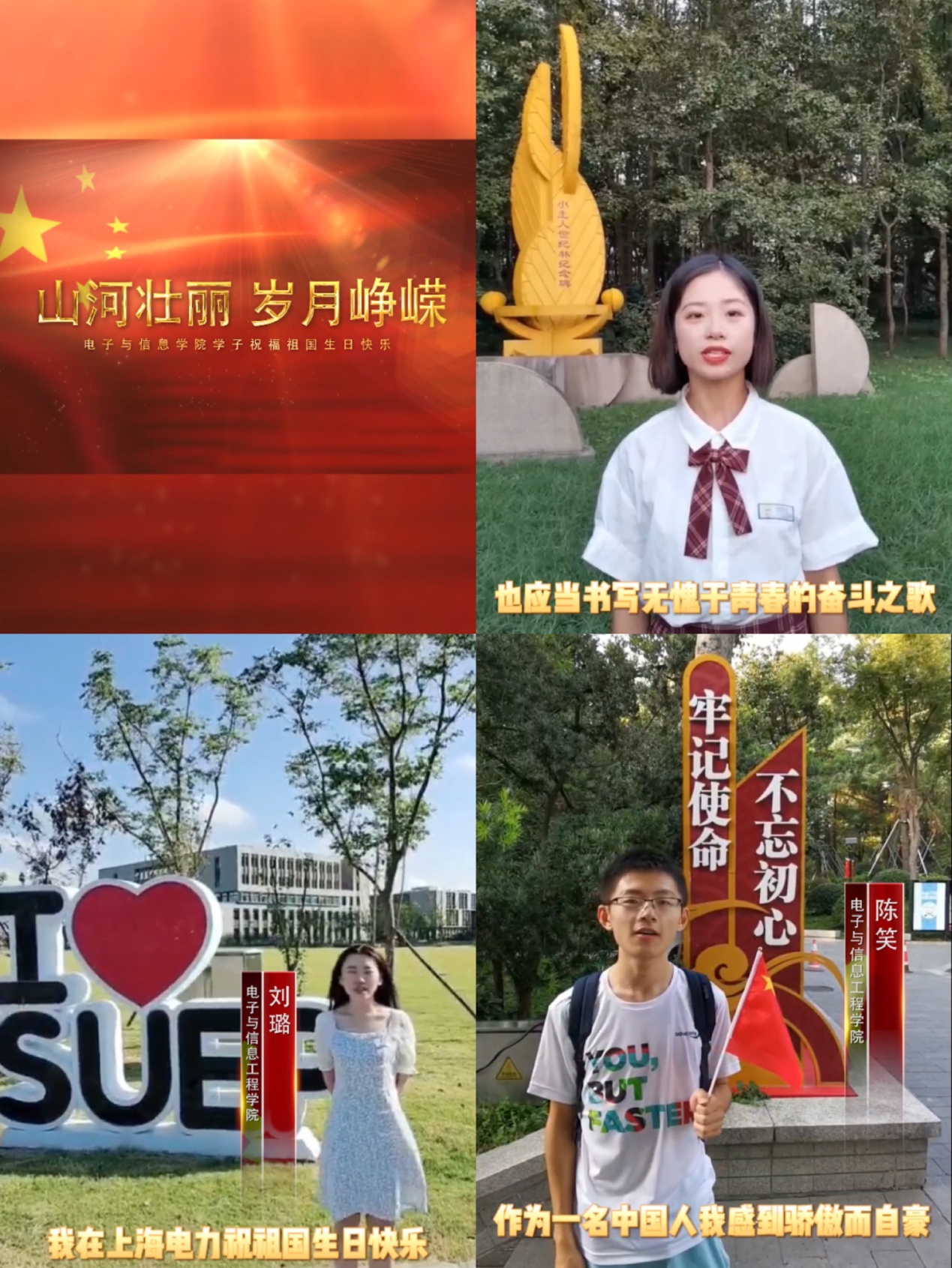 为庆祝新中国成立72周年,迎接我校70周年校庆,抒发电信学子爱党爱国爱校情怀,展示蓬勃向上的精神风貌,十一期间学院组织“深情向祖国告白,献礼上电70周年”主题短视频征集活动,同学们向祖国72周年华诞和上电70周年华诞纷纷送上了自己的祝福,祝福祖国繁荣昌盛,祝福学校桃李天下,通过活动的参与,展现了同学们感恩母校,热爱祖国的真情实感。
