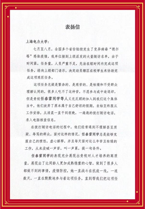 信中指出,今年暑期变异病毒“德尔塔”来势汹汹,平度市新河镇因靠近当时为“中风险地区”的烟台市,相关排查工作给当地疫情防控部门带来了不小的挑战。任春雷同学积极报名参与疫情防控志愿服务活动,放弃了舒适的假期,面对繁杂、艰苦、枯燥的工作和群众的不理解,都能耐心处理。任春雷同学负责电话随访、信息核查录入等工作,从清晨一直干到夜晚,一连数日,直到配合当地部门完成任务。任春雷同学以实际行动充分展现了当代大学生的优良素质、崇高品格、家国情怀和新葡亰88805ntt人才培养的高质量,同时感谢学校对学生品德的精心培育。