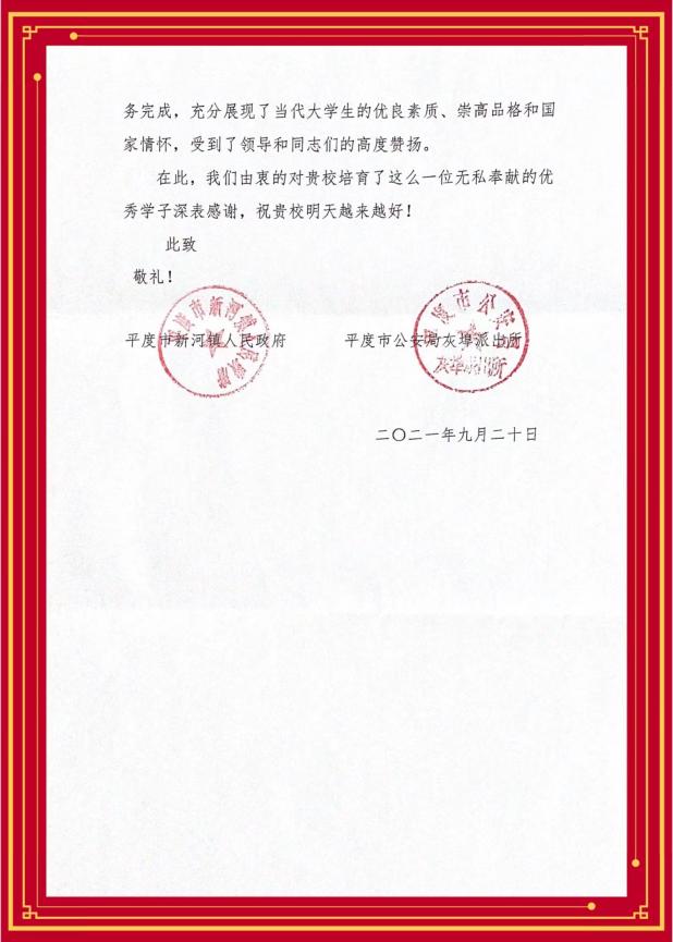 近日,校团委收到山东省平度市新河镇人民政府、平度市公安局灰埠派出所联合发来的表扬信,赞扬了新葡亰88805ntt2020级学生任春雷在暑期志愿服务疫情防控中的工作表现。