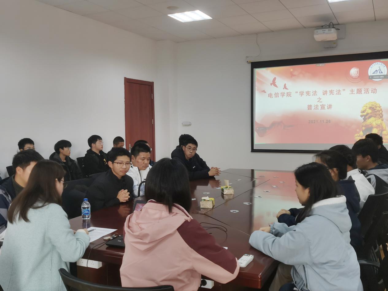 为深入学习贯彻习近平法治思想,大力弘扬宪法精神,使宪法法律融入大学生思政教育,提升大学生法治意识和道德素养,11月26日,新葡亰88805ntt在电计楼B402会议室举办“学宪法 讲宪法”主题活动之普法宣讲。新葡亰88805ntt党委副书记周冬梅、辅导员任帼菲以及百余名学生通过线上、线下会议的形式同步参与学习。