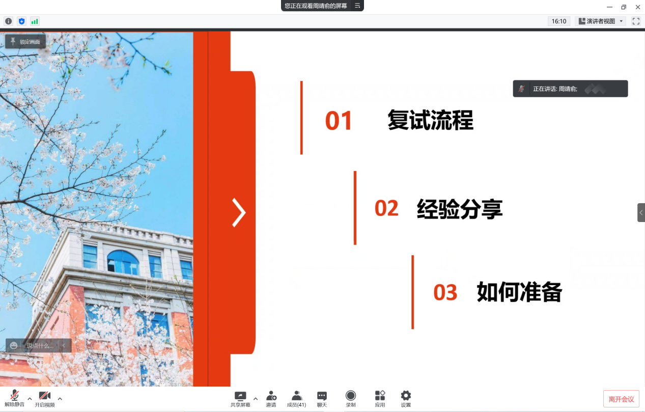 第二个环节由薛亮老师进行复试指导。薛老师强调首先是做好知识储备,理清毕业设计的脉络,同时要复习好除初试和复试科目以外的一门擅长的课程。其次是环境准备,线上复试要求是双机位,要确保自己的桌子上没有任何的资料或者纸张,房间环境要干净整洁,复试过程中确保环境中只有自己。最后是个人准备,着装方面简洁大方即可,在复试过程中如果没有听清楚老师的问题可以提出,但次数不要过于频繁。在英语面试环节,老师更注重于学生的态度、口语流利程度以及词汇丰满度。进行专业知识面试时,要保持头脑清醒,遇到不清楚的问题很正常,不要不懂装懂,保持谦逊态度。自由面试时会问一些学习或者生活方面的事,可以将自己的科创经历、获奖情况说出来,突出自己的亮点。面试过程中不要执着于一个没有回答好的问题,从容地展现自己,要有自信,保持平常心。