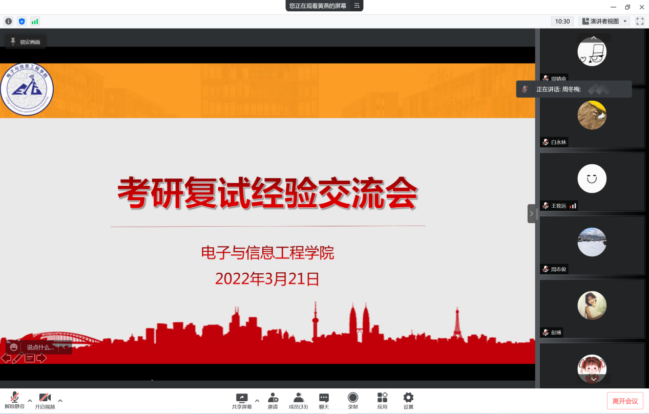 抗疫不停学,在这段特殊时期,为了使进入考研复试的同学掌握更多相关技巧,以良好的状态备战复试,新葡亰88805ntt于3月21日晚上7:00举办了线上“考研复试经验交流会”。新葡亰88805ntt党委副书记周冬梅、光电科学与信息工程专业教师薛亮、就业专项负责人黄燕、毕业班辅导员许晓天、崔释匀参会。会议还邀请了往届优秀学子进行分享。
