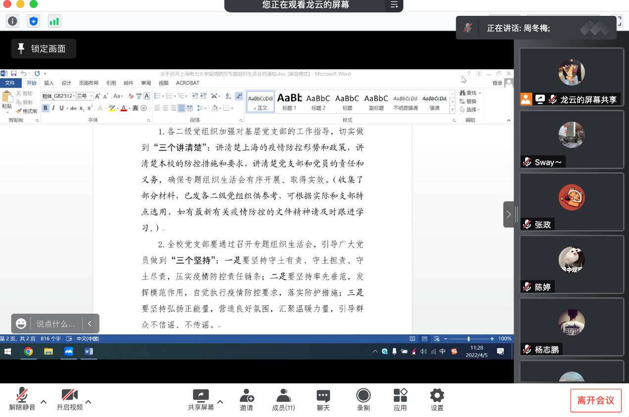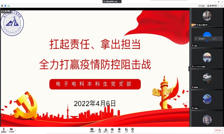 会上,各支部党员共同交流了近期的学习和生活。疫情发生以来,各支部党员积极响应号召,积极落实“双报到”要求,积极参与到社区、学校的疫情防控工作中。
