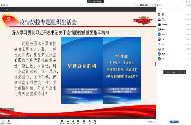 为进一步传达党中央、教育部、上海市疫情防控有关精神和要求,明确上海高校疫情防控形势和学校疫情防控要求、明确党支部与党员的责任与义务,引领党员充分发挥党员在防疫工作中的先锋模范作用,新葡亰88805ntt各党支部在4月5-6日召开疫情防控专题组织生活会。
