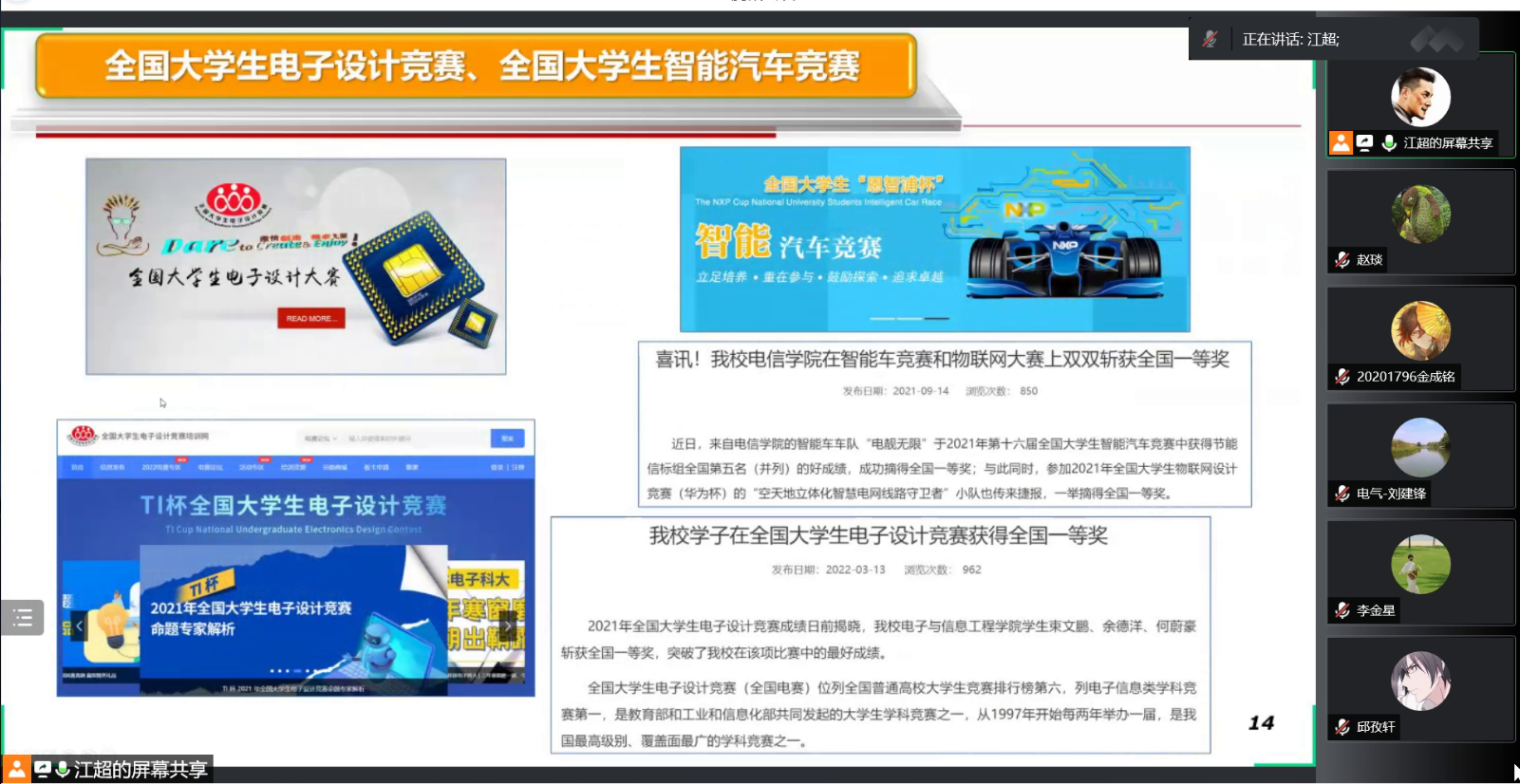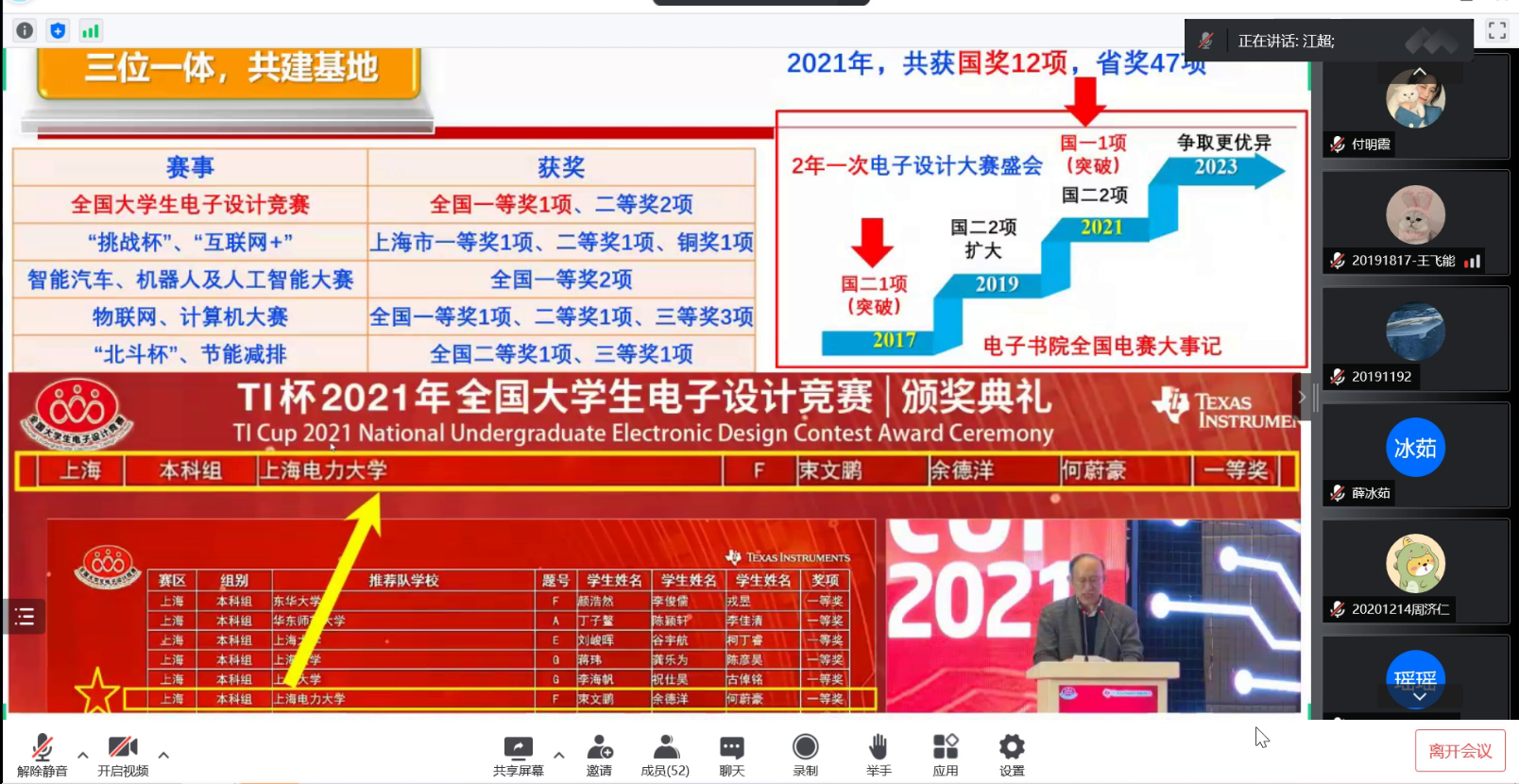 江超老师从专业、学科、工程教育认证的12条毕业要求以及“互联网+”大学生创新创业大赛切入主题,创新创业教育是一个系统性的工程,与教育教学相辅相成,同为一脉。解读了学院创新创业训练与实践学分管理办法以及本科生科研能力提升计划管理办法。详细介绍了新葡亰88805ntt创新创业教育基地--电子书院-科创中心-电子学社一体化窗口建设,回顾了近年来学院在互联网+、挑战杯、电子设计竞赛、智能汽车竞赛等各类含金量颇高的赛事中的辛勤付出与收获。以及双创基地在社会服务方面做出的突出贡献:积极参加70周年校庆、招生宣传、校宣传片拍摄等活动;2次承办临港大学堂科创小英才新葡亰88805ntt创客未来夏令营活动;2021年以来走出校园,科普宣讲十余场次,服务上千名中小学生。