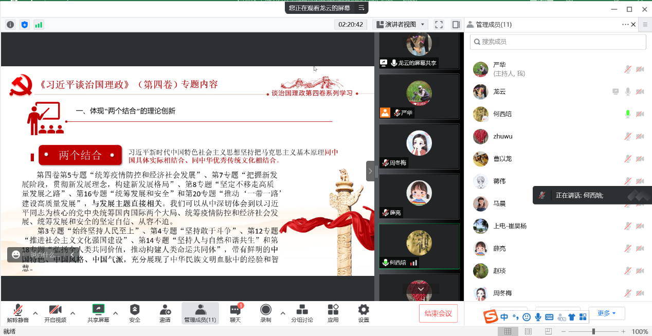 9月7日新葡亰88805ntt党委理论中心组集体学习《习近平谈治国理政》第四卷。会上何西培以“体现‘两个结合’的理论创新”“体现‘十个明确’的丰富发展”“‘三大时代课题’贯穿全书”三个部分介绍了《习近平谈治国理政》第四卷所涉及的专题内容。