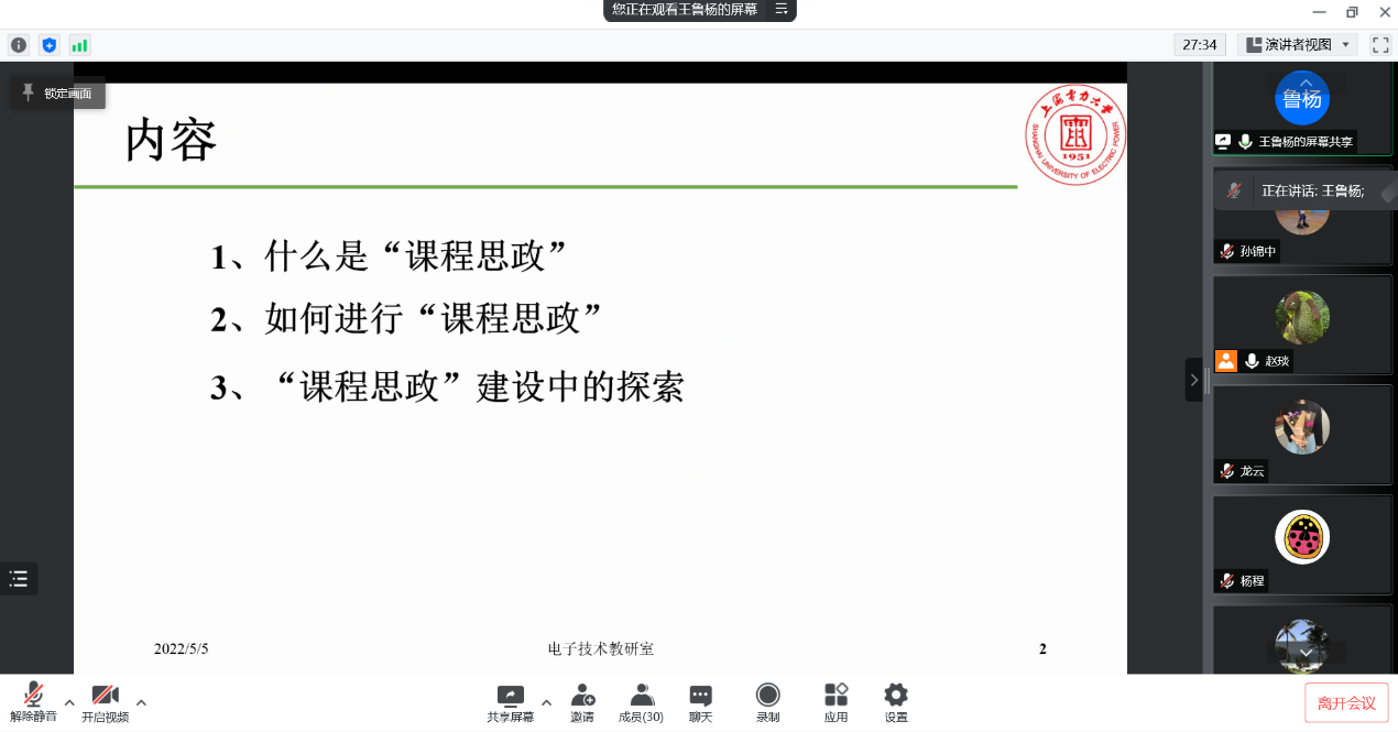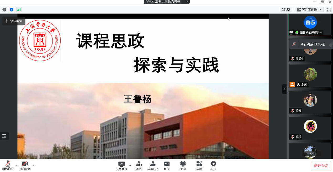 5月5日,新葡亰88805ntt邀请了电气工程学院电子教研室主任王鲁杨老师在腾讯会议线上为学院教师主讲题为《课程思政-探索与实践》的学术讲座。学院党政班子领导和各专业教师参加了会议。