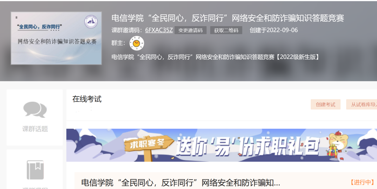 活动周期间,学院组织学生通过教育部思想政治工作司指导中国大学生在线开设的“守护青春、网络有你”学习专区,深入学习《网络安全法》及相关法规,丰富基础理论知识;组织学生观看“高校师生同上一堂网络安全课”网络安全公开课,从学生网络安全意识树立、个人信息保护、防范电信诈骗等维度,提升全体同学的网络安全意识和防护技能。充分利用线上、线下各类宣传平台,依托易班、学院公众号发布相关网络安全知识,全面营造共筑网络安全防线的浓厚氛围;组织学院800余名师生参加“守护青春 网络有你”2022年全国大学生网络安全知识竞赛,在寓乐于教中号召大家积极参与到网络安全知识学习中,普及网络安全知识。
