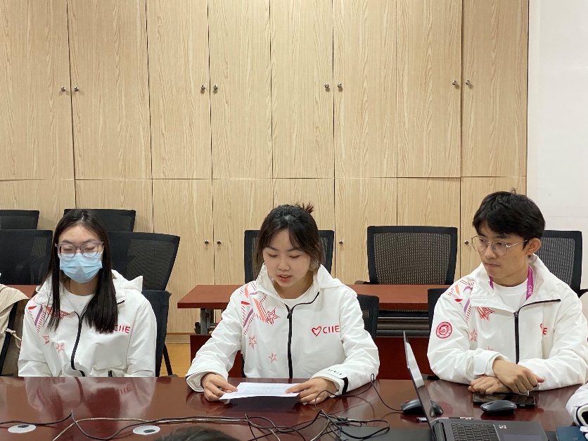 周冬梅介绍了新葡亰88805ntt第五届进博会志愿者的总体情况。新葡亰88805ntt积极响应校团委的部署,九月底开展进博会志愿者招募工作,共计67名同学积极报名参加,经过层层筛选,最终选拔出10名进博会志愿者。其中,研究生1人,本科生9人。10人中,有2人参加过进博会志愿服务;7人参加过社会实践,占总人数的90%。本届进博会电信“小叶子”的工作主要分布在展务、进博会信息系统综合岗、入场证件服务点三大岗位。