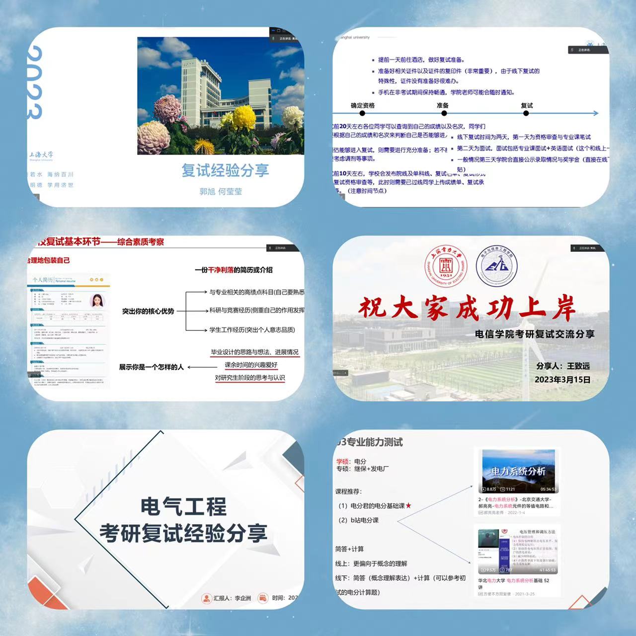 会上,大家结合自身经验作分享。王致远从英文自我介绍、专业知识问答、综合素质考察三个方面对复试流程进行了详细的介绍,强调要根据自己的实际情况,实事求是回答问题。矫玺本从选导师、预面试、专业课等多个方面为报考电子科技大学的考研学子们解答疑惑,他强调在准备复试前需要了解对应专业的导师信息,同时要多模拟、多练习,以充足的准备去应对复试。李企洲重点分享了我校电气学院复试时的经验,强调在英语能力测试中的问答环节时要注意运用专业词汇,回答要突出逻辑性,切忌紧张慌乱。周靖俞结合上海理工大学的复试进行了分享,提醒同学们调整好心态,面试过程中要尽量展示自身的优点与特长。张相鹏分享了本校跨考调剂经历,指出在调剂时要慎重选择,保持良好的心态,积极应对挑战。郭旭和何莹莹围绕上海大学的复试科目、复试流程等方面做了详细的介绍,建议在复试前准备一份亮点突出的简历,并对内容要了然于胸,为面试做充足的准备。