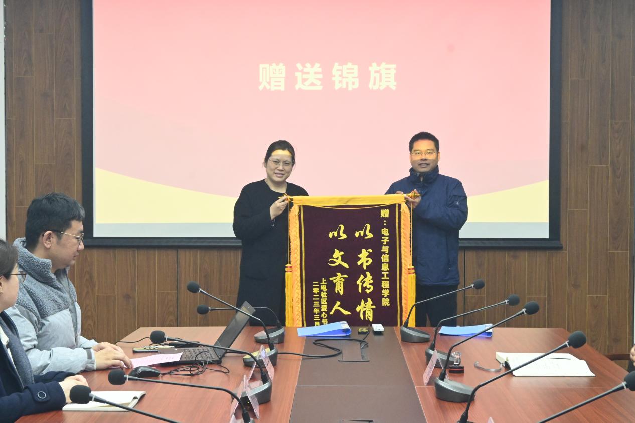 会议伊始,上电社区爱心书屋负责人王严超宣读了上电社区爱心书屋致新葡亰88805ntt的一封感谢信。感谢新葡亰88805ntt向爱心书屋捐赠的700余本书籍和近50袋衣物,后勤管理处以上电社区爱心书屋的名义向新葡亰88805ntt赠送了“以书传情,以文育人”的锦旗。