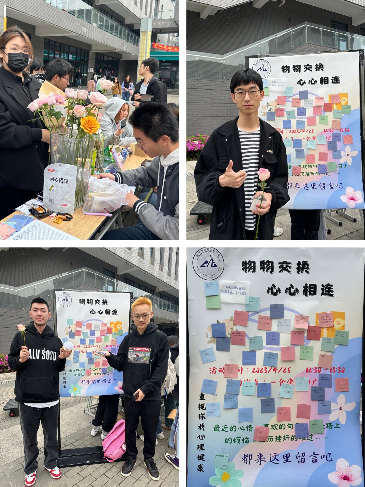 物物交换心心相连,营造校园和谐氛围。4月25日,在临港校区一食堂门前小广场开展物品传递交换留言活动,为同学们提供了一个分享互换的平台,用自己闲置的东西来换取自己需要的东西,并在留言板进行留言,学院也提前为同学们准备了鲜花作为交换的物品,在分享快乐的同时也能从他人的分享中收获能量,舒缓压力,亲身体会“赠人玫瑰、手有余香”的价值感和充实感,活动收到了热烈反响,共计70余人次参加。