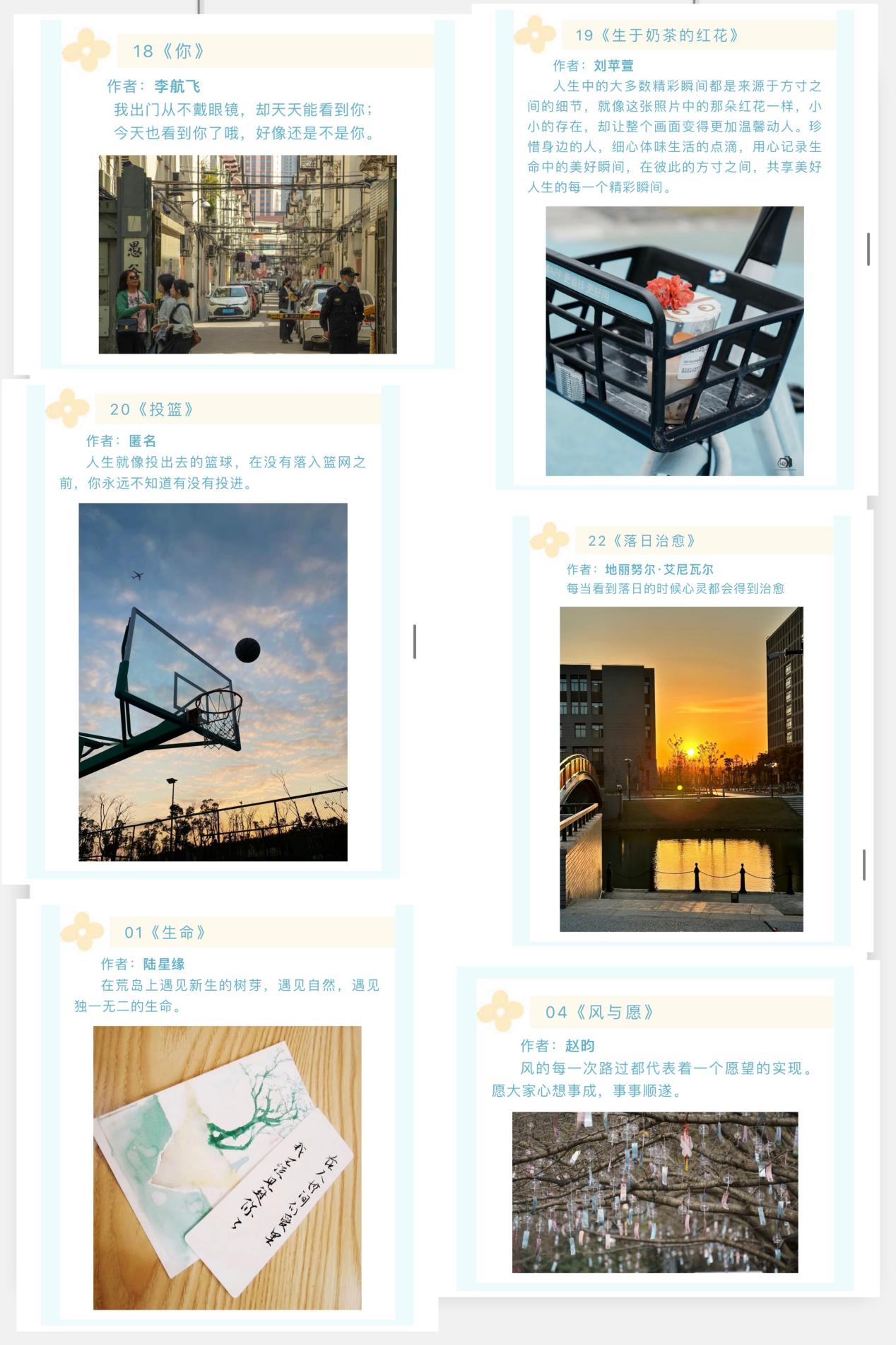 方寸之间意惹情牵,善于发掘自身能量。通过开展摄影作品和书签投稿分享活动,用生动的画面和温暖的话语,来传播快乐、传递能量,活动共计收到学院各年级同学的投稿作品40余份,最终评选出31份作品通过学院微信公众平台进行展示。每一张照片与书签都有自己的声音,每一个文案都传递了作者的思想,这些美好的瞬间可能引起作者与观众之间的共鸣,亦或是不同的思考,最终收获美好的心情。