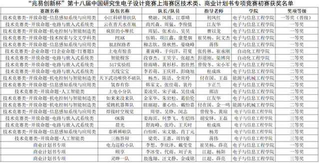 我校研究生樊融、凤圆、江覃晴组成的“小江科研帮扶队”团队荣获技术类竞赛国家三等奖;董寅峰、于向洋、符夏组成的“上电有惊喜”团队荣获IT企业命题组国家三等奖;吕俊杰、韦秀松、李鑫朋组成的“图像不队”团队荣获安谋科技(ARM中国)企业命题组国家三等奖。我校初凤红、江友华、曹以龙、崔昊杨、蒋伟5位老师荣获上海赛区“优秀指导老师”称号,我校也荣获上海赛区“优秀组织奖”(共9家单位)。