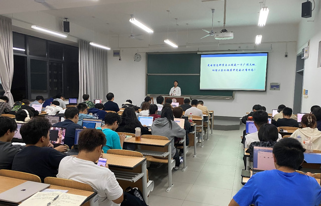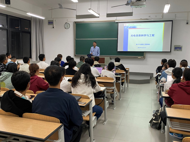 10月9日,光电信息科学与工程专业班主任朱武老师向同学们介绍了光电信息科学与工程专业的专业特色,针对大一学生的课程特点,详细向同学们介绍了本学期开设的专业课程,鼓励大家多向学长学姐请教,也可以随时与老师交流,为同学们在所学专业的深入学习,与未来发展上提供建议与参考。他勉励同学们积极投身科创、文艺、体育等各种比赛,在比赛中锻炼提升自己的综合能力。朱老师还和同学们分享了光电方向的研究现状和发展前景,探讨了光电研究与日常生活、科技发展的深度联系,希望同学们密切关注学科前沿和行业动向,在校期间扎实专业基础,磨练动手能力,提升综合素质,为今后的发展打下良好基础。
