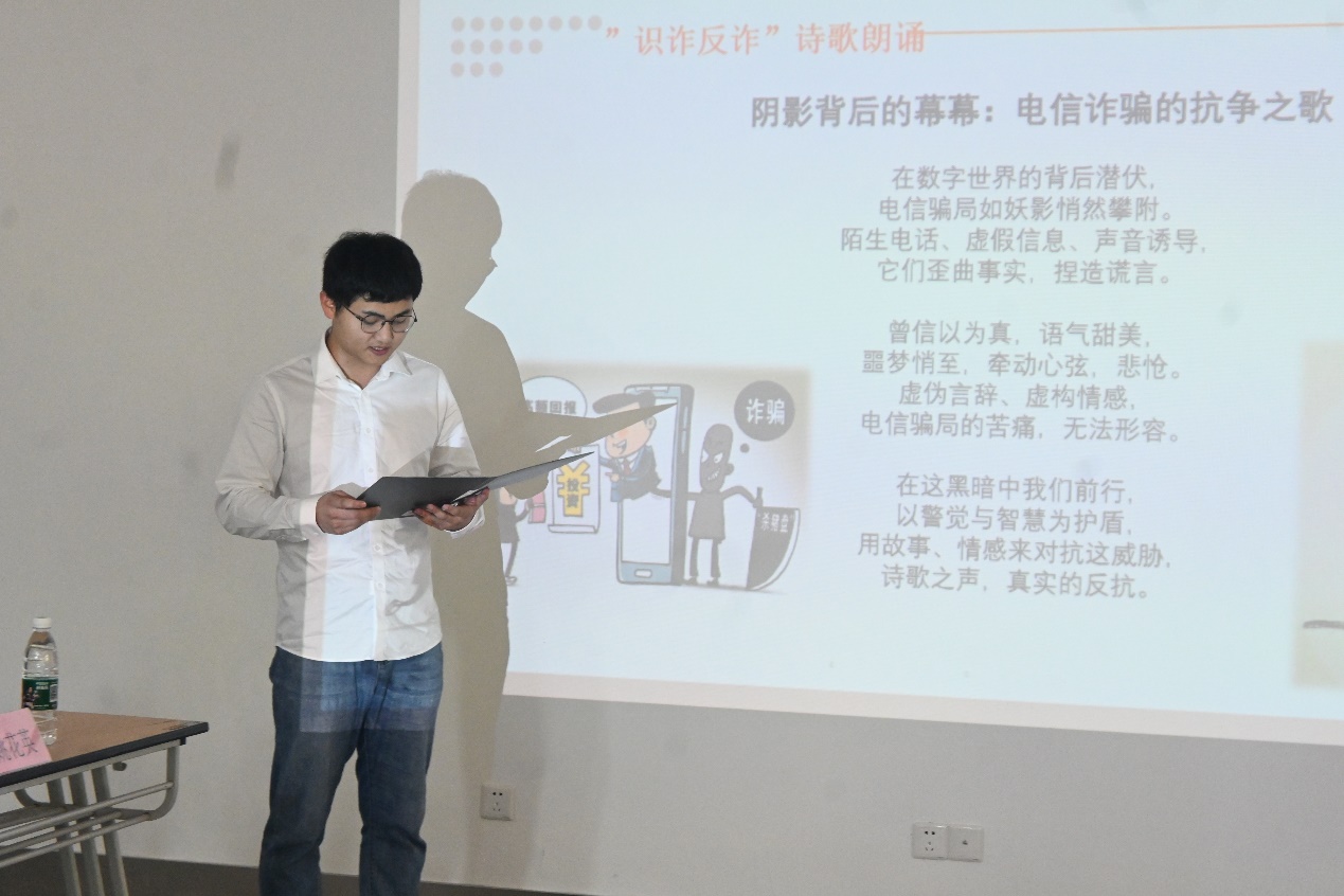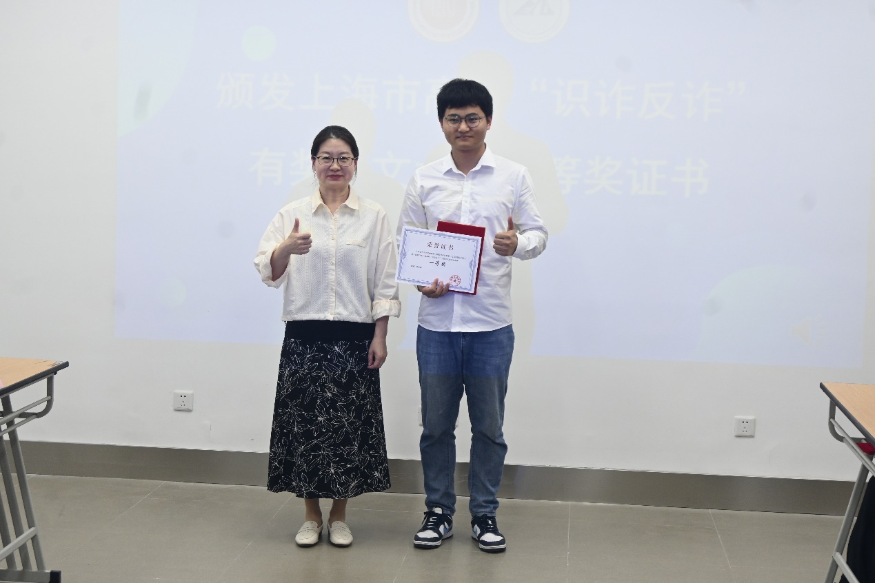 周冬梅为新葡亰88805ntt研究生张家想颁发了上海市高校“识诈反诈”有奖征文大赛一等奖证书,张家想在会上朗诵了获奖作品《阴影背后的幕幕:电信诈骗的抗争之歌》。